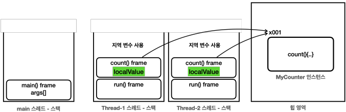 `count()` 메서드를 다수의 스레드에서 호출했다고 생각해보자. 이 때, 각 스레드의 스택에 `count()` 프레임을 얹게 된다. 스레드마다 개별적인 `count()` 프레임을 갖게 되고, 각 프레임에 개별적인 지역 변수들이 자리잡게 된다. 애초에 공유하는 자원이 아닌 것이다.
