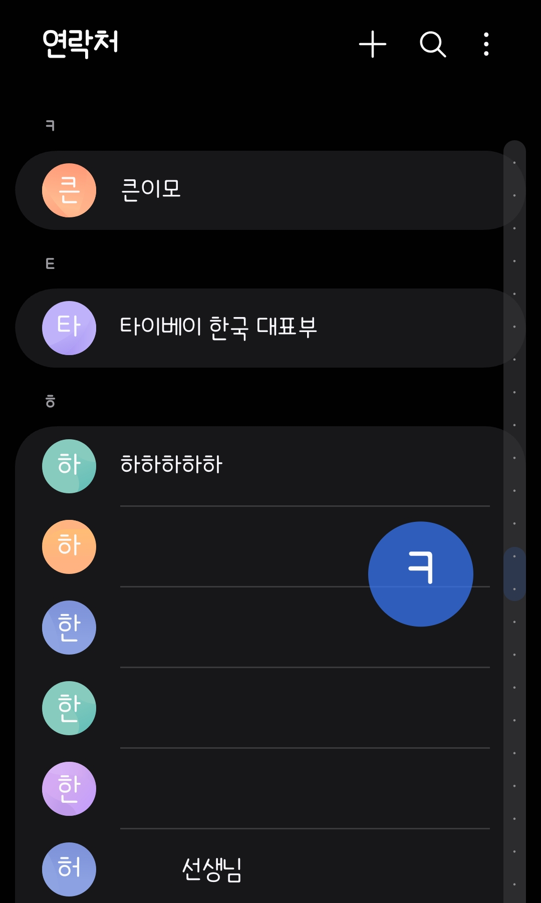 대신, 만약 ㄱ, ㄴ, ㄷ 자음으로 색인이 걸려있다면? 오른쪽 사진과 같이 ㅋ 을 눌러서 바로 ㅋ으로 시작하는 연락처 항목으로 넘어갈 것이다. 이 연락처 앱에는 ㅋ이 얼마나 내려가야 있는지 이미 색인 정보가 저장되어 있는 것이다.