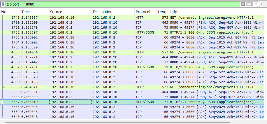 로컬 네트워크(192.168.0.10 / 휴대폰)에서 `http://192.168.0.2:8080/carematching/api/caregivers` 요청을 했다.